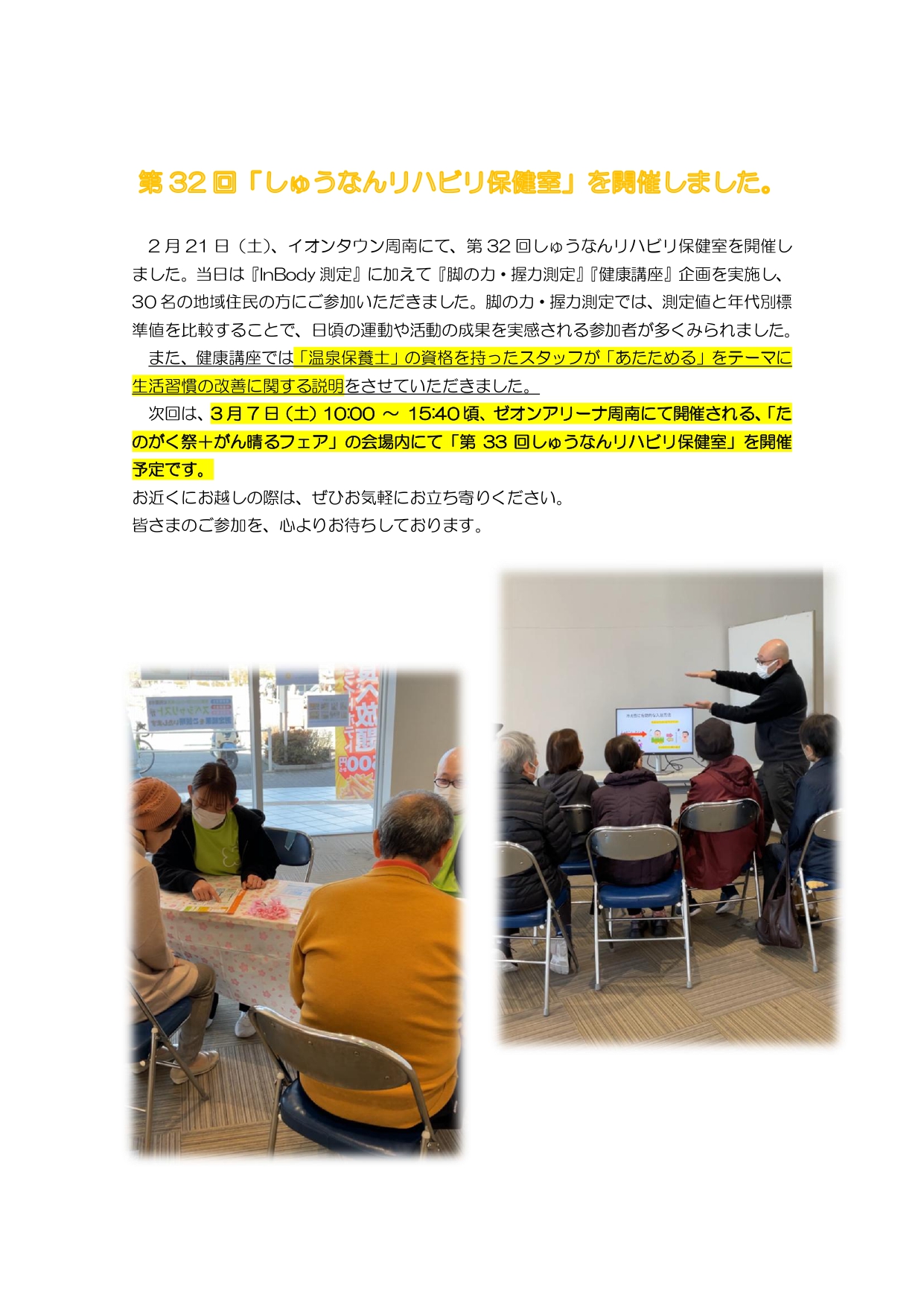 第32回しゅうなんリハビリ保健室を開催しました。次回は 3/7(土) ゼオンアリーナ「たのがく祭+がん晴るフェア」の会場にてお待ちしています。